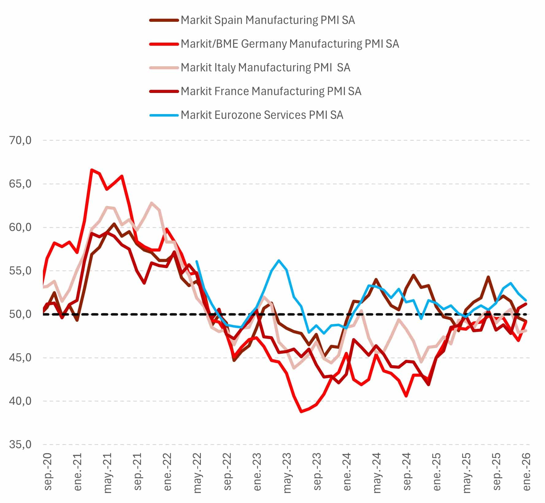 En cuanto a los indicadores de alta frecuencia, el PMI compuesto se mantuvo en 51,5 puntos en enero, con un deterioro en Francia (48,6) vinculado a la incertidumbre política y una mejora en Alemania (52,5). Por componentes, servicios tiró del agregado (aunque con retroceso en Francia), mientras que el de manufacturas mostró mejoras modestas (49,4). Resulta reseñable el salto del índice de precios de salida en servicios en Alemania, potencialmente asociado a la subida del salario mínimo en enero. De sostenerse el nivel actual del PMI, ello sería coherente con un crecimiento cercano a 0,2-0,3% t/t en el primer trimestre de 2026 (véase gráfica 1).