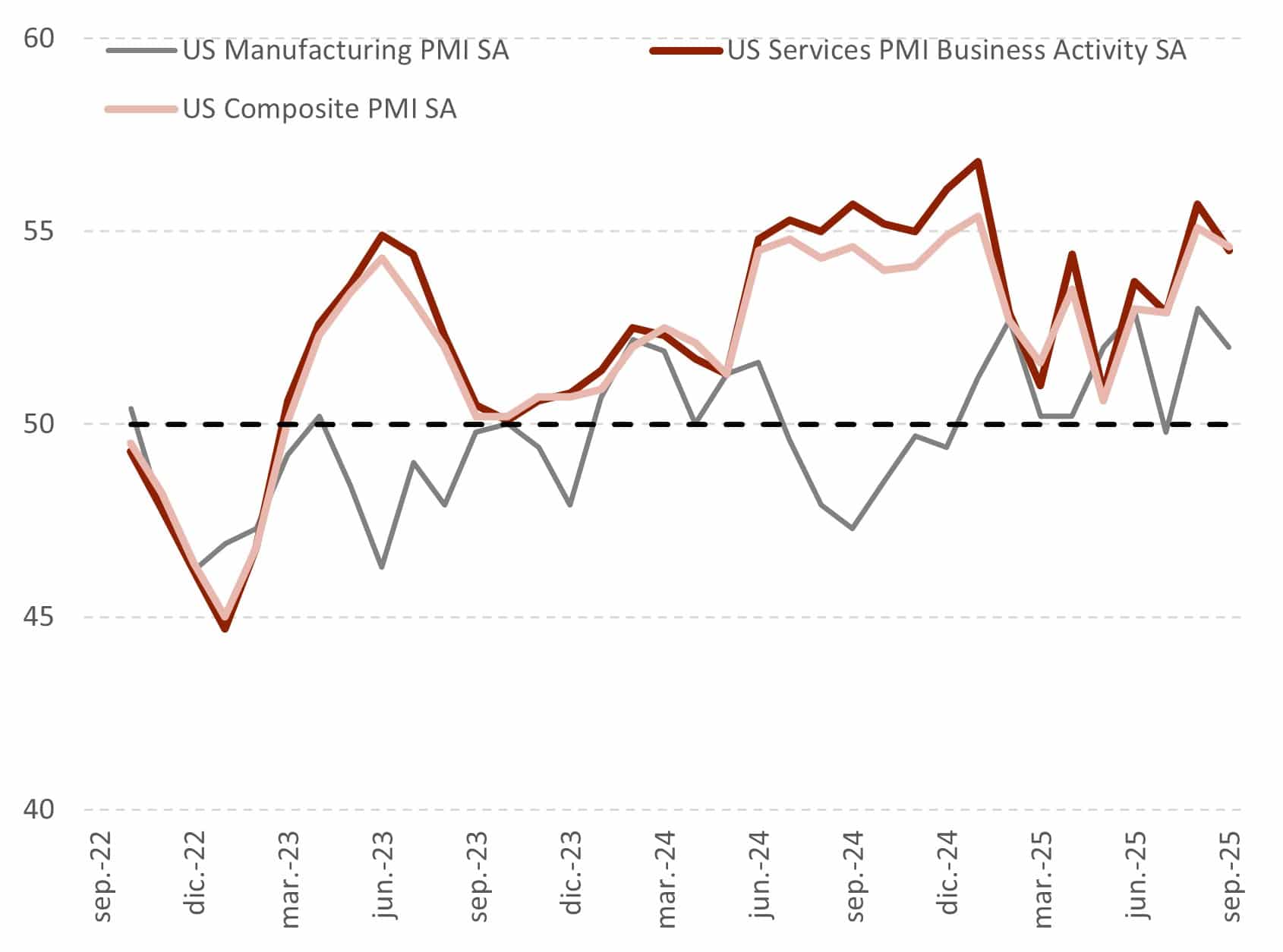 Turning to activity, the latest October PMIs (see Chart 2) suggest that economic activity picked up again during the month, with both the manufacturing and services sectors expanding at a pace consistent with GDP growth of around 2.5%. When incorporating investment growth estimates—driven largely by private investment and, in particular, strong momentum in data center construction—overall GDP growth could well exceed 3%, as indicated by the Atlanta Fed’s GDPNow projections (see Chart 3).