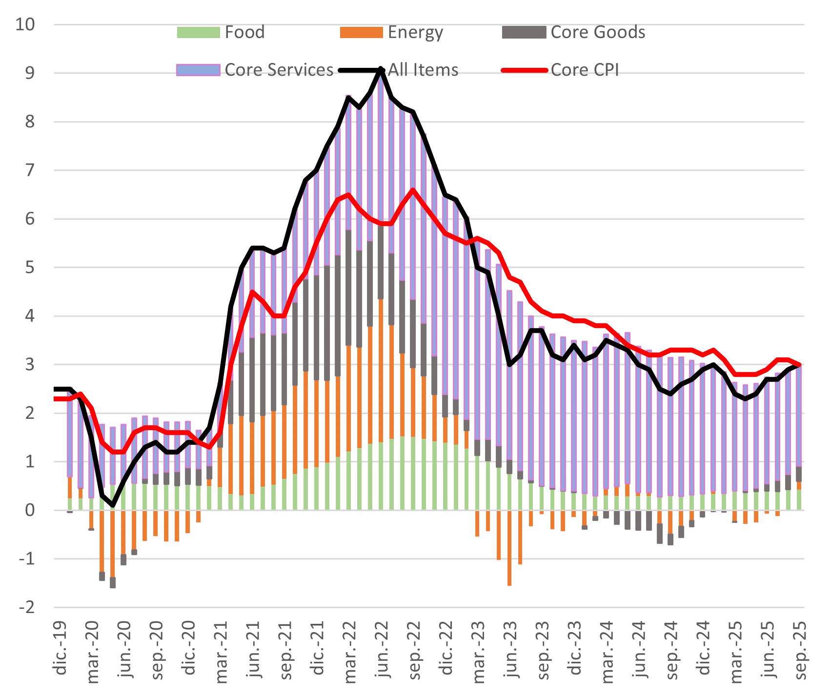 As for inflation, the September report showed a 0.3% MoM increase (3.0% YoY), driven mainly by a rebound in energy prices (+1.5% MoM; +2.8% YoY) and food prices (+0.2% MoM; +3.1% YoY). Goods inflation remained moderate (+0.2% MoM; +1.5% YoY), while services inflation continued to ease (+0.2% MoM; +3.5% YoY). As a result, core inflation stood at 3.0% YoY, indicating that, so far, there are still no visible signs of inflationary pressures stemming from tariffs (see Chart 3).