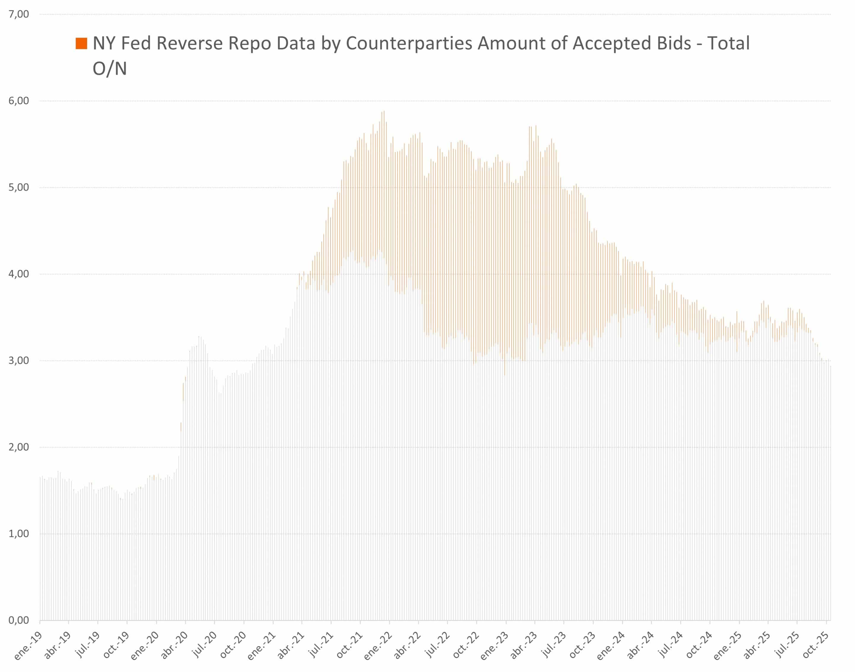 Lastly, and closely linked to the decision to halt balance sheet reduction under QT, the exhaustion of repo operations—together with bank reserves gradually approaching more con-strained levels (moving away from what the Fed itself classifies as “ample”)—appears to provide sufficient reason for the central bank to act with some caution at this stage. In this regard, although there have been no early signs of severe liquidity stress, past experience underscores the value of taking preventive action as the period of excess liquidity draws to a close (see Charts 4 and 5).
