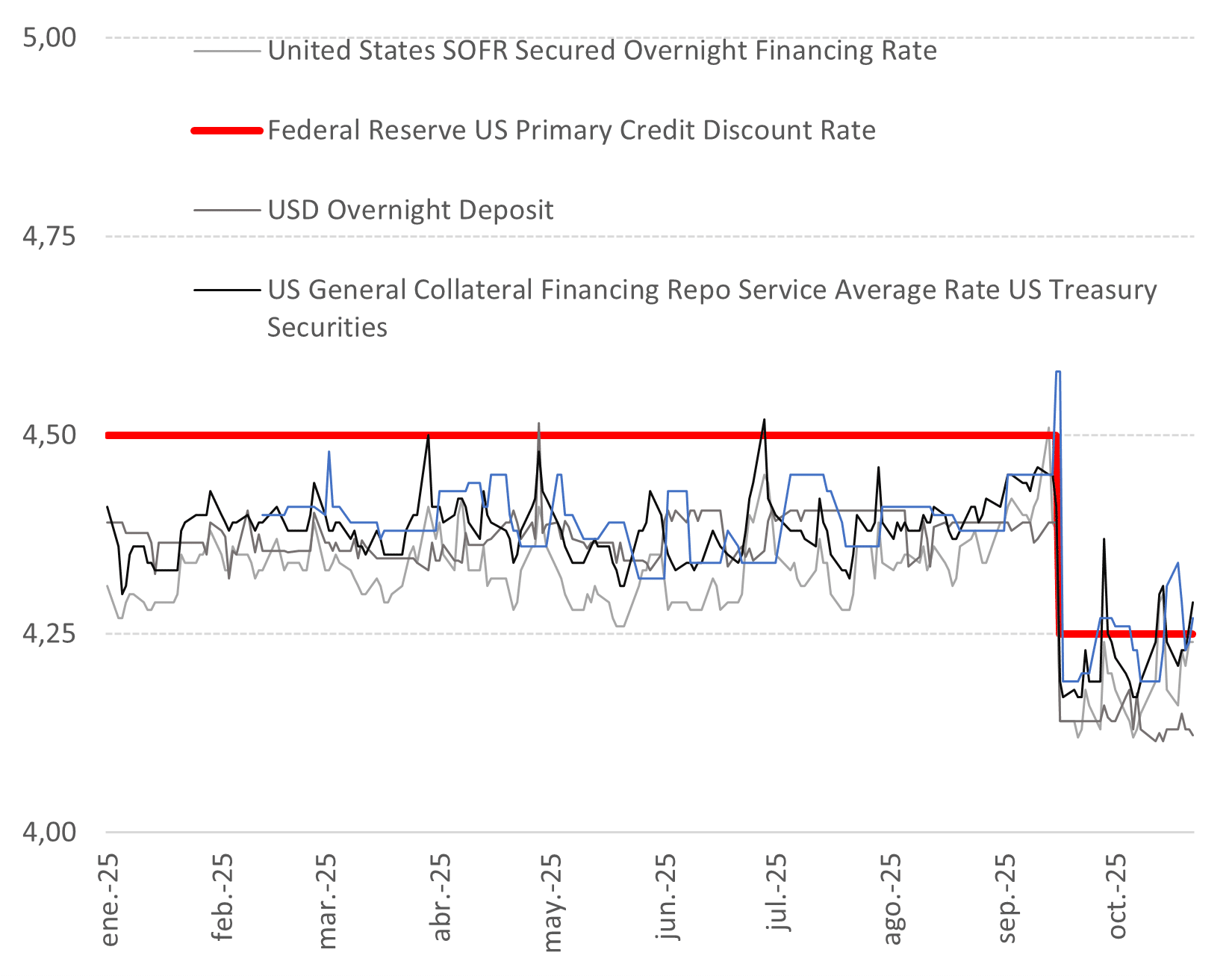 Since the last meeting, the flow of new information available for analysis has been limited by the government shutdown, which has delayed the release of key economic data. Even so, the data published so far points to a broadly steady trend, consistent with the Fed’s previous narrative and balance of risks. The labor market continues to show signs of gradual cooling, overall activity has remained unexpectedly resilient, and inflation—though still above target—posted another decline in September. Accordingly, in the absence of major surprises, the Fed’s plan to proceed with a gradual path of monetary easing remains on track, with the policy roadmap still pointing toward a more neutral stance. Notably, and justified by the recent deterioration in money market conditions, the Fed announced the end of quantitative tighten-ing (QT). While this step responds to only moderate pressures for now, it marks a clear turning point in the central bank’s policy trajectory
