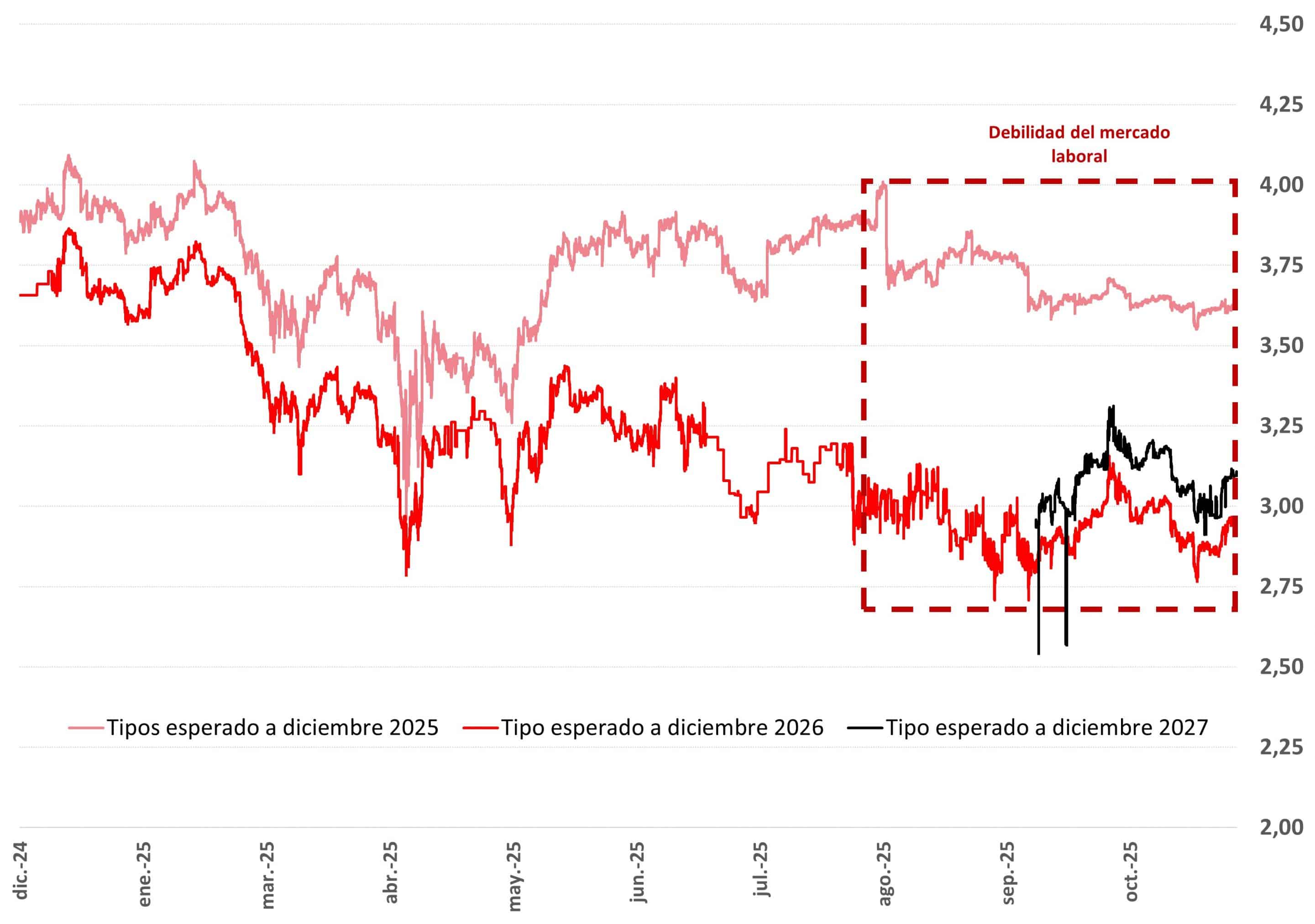 In conclusion, the data still appears to give the Fed leeway to continue lowering interest rates, albeit partly in the dark. The delay in government data releases makes it harder to fully assess the economic landscape, but not enough to alter the September outlook, when the narrowing gap between inflation and employment objectives helped rebalance the overall risk assessment. This brings little change to interest rate expectations for the remainder of the year and for 2026 (see Chart 6), but it also does not warrant a firm com-mitment to that path going forward. The probability of a 25-basis-point rate cut in December has fallen from 95% to 70%. Therefore, now that balance sheet normalization has concluded, optionality will remain the prevailing approach within the FOMC, allowing policymakers to maintain flexibility and respond swiftly to future economic develop-ments.