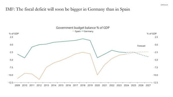 El buen desempeño de la economía española está atrayendo mucha atención por parte de organismos internacionales. La situación nacional contrasta con la de Alemania que lleva varios años enfrascada en una situación de crecimiento muy débil debido a los altos costes energéticos que han lastrado la producción industrial. Como respuesta, en Marzo de este año el gobierno alemán decidió romper sus reglas de déficits y techos de deuda con la intención de aplicar un estímulo fiscal que ayude a devolver al país germano a su brío económico como motor de Europa. Este mayor volumen de emisión de deuda ha provocado que el FMI haya vaticinado por primera vez en muchas décadas que el déficit fiscal será mayor en Alemania que en España.