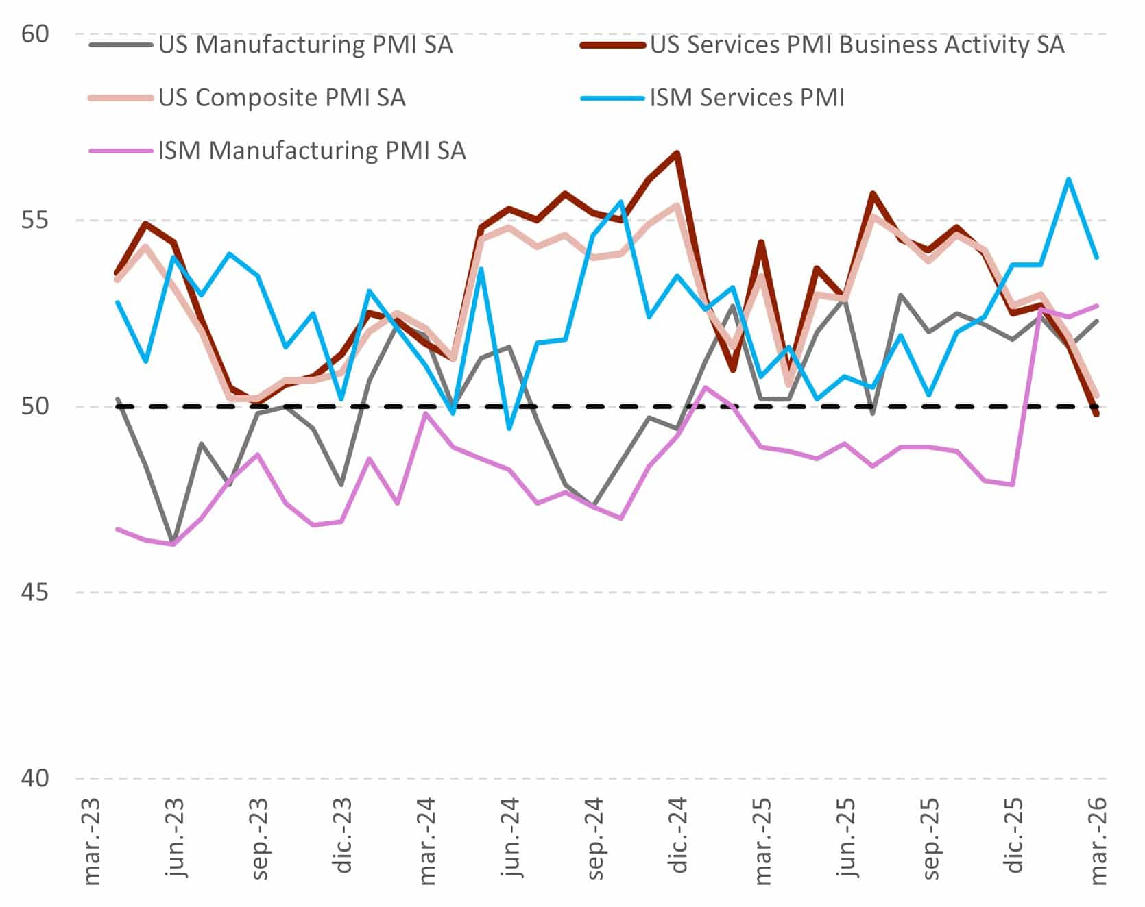 Por lo que se refiere a la actividad económica, la información más reciente arroja la imagen de una economía estadounidense que sigue creciendo, pero con un deterioro progresivo en la calidad del crecimiento. Los últimos indicadores adelantados de actividad (PMI e ISM) continúan situándose en niveles compatibles con la expansión, aunque con una señal cada vez más clara de moderación en los nuevos pedidos, mayor cautela empresarial y cierta pérdida de tracción en el empleo, especialmente en las manufacturas, mientras que los servicios muestran que mantienen los niveles de actividad más por inercia y traspaso de costes que por un fortalecimiento de la demanda final (véase la Gráfica 1).