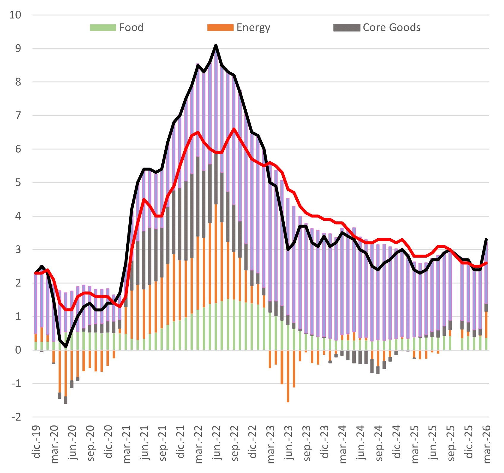 Por el lado de la inflación, el dato de marzo repuntó hasta el 3,3% a/a, confirmando que el proceso desinflacionario ha perdido tracción, pero también que ciertos componentes se ubican en entorno más contenido e irregular. Mientras que gran parte el impulso provino del componente energético y partidas intensivas en el uso de combustibles y logística, el proceso de desinflación en vivienda y en el núcleo de servicios mostró cierta estabilización (véase la Gráfica 2).