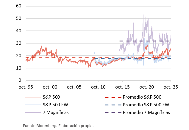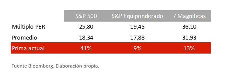 Una vez entendido esto, vamos a poner en cifras al mercado americano, que es el principal foco de preocupación en cuanto a valoración se refiere en la actualidad, y lo vamos a separar en 3 grupos: S&P 500, S&P 500 Equiponderado (EW) y las famosas 7 Magníficas.