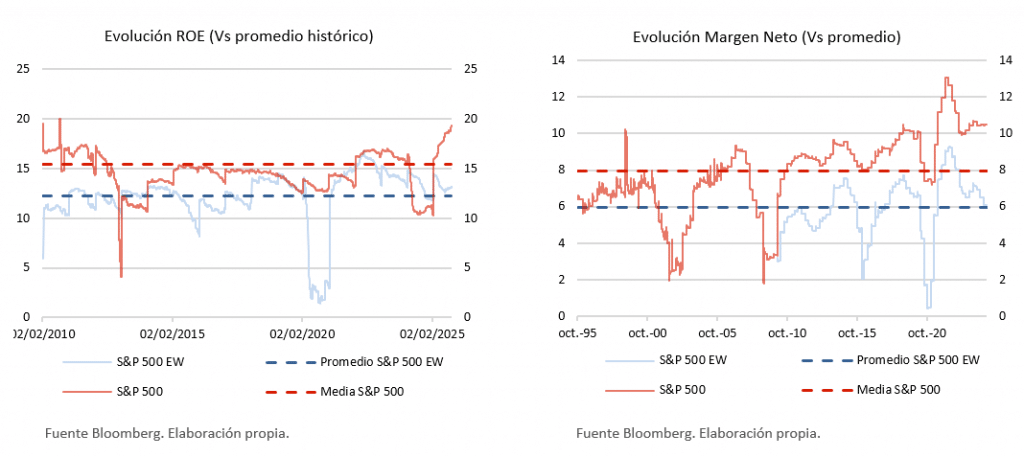Con estos nuevos datos es evidente que las conclusiones deben cambiar. Tanto ROE como márgenes están por encima de su media histórica y con previsión de seguir mejorando. Además, también se puede concluir que el índice capitalizado cuenta con retornos y márgenes mucho más amplios que el mercado general, por ponerlo en números, S&P 500: ROE del 19% (+22% de prima) y Margen del 11% (+42% de prima); mientras que el mercado (S&P 500 EW): ROE del 13% (+7,37% de prima) y Margen del 6,32% (+6% de prima).