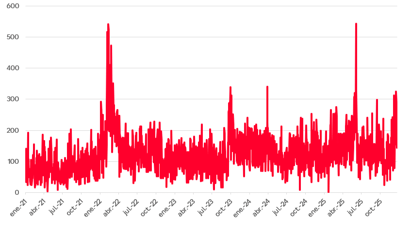 Los acontecimientos geopolíticos están dominando los titulares en este arranque de año pese a que los mercados se mantengan impasibles y continúen con la buena marcha con la que acabaron el año 2025. El índice de riesgo geopolítico elaborado por los economistas de la FED Dario Caldara y Matteo Iacoviello alcanza niveles que, en otras ocasiones, ha sido seguido por una corrección en el S&P500 de más del 100%.