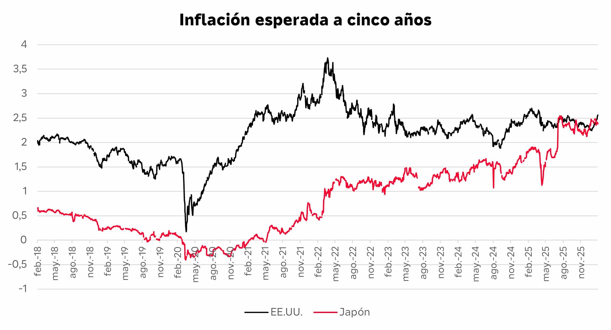 Tras muchos inmersos en una deflación que parecía permanente, la economía japonesa parece haberse normalizado: el crecimiento económico ha repuntado y también lo ha hecho la inflación. Tanto es así que, por primera vez en más de siete años, la inflación que el mercado de bonos descuenta a cinco años es mayor en Japón que en Estados Unidos. Esta mayor inflación es, entre otras razones, uno de los factores que ha provocado el espectacular alza en los tipos de interés de los bonos japoneses y los episodios de volatilidad reciente en los mercados de bonos.