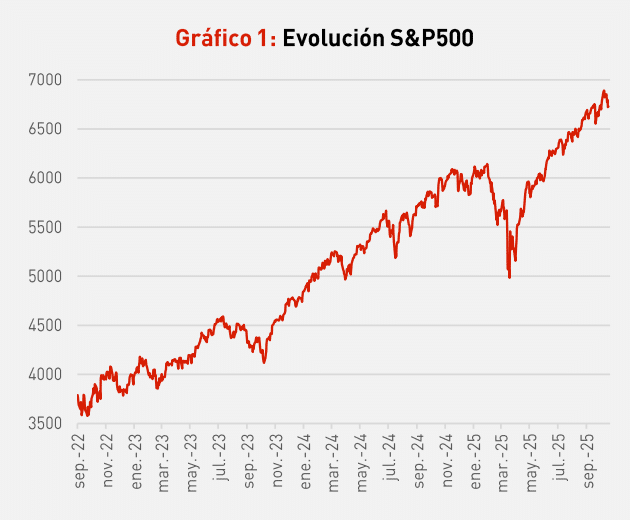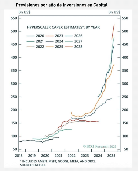 Nuestra visión sigue siendo constructiva en activos de riesgo en general dado que las empresas siguen siendo capaces de generar beneficios en un entorno financiero con incertidumbres pero estable. La temporada de resultados del tercer trimestre está siendo muy positiva en términos de crecimiento de beneficios y porcentaje de compañías que baten expectativas. Las grandes inversiones para desarrollar e implementar la Inteligencia Artificial está provocando que el crecimiento de la economía norteamericana se sustente cada vez más en inversiones de capital que en un consumo donde comienzan a aparecer síntomas de stress especialmente en las familias con los ingresos más bajos.