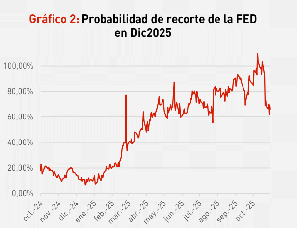 En Renta Fija, la rentabilidad exigida a los bonos de deuda pública descendieron especialmente en los tramos más largos de las curvas. La TIR del bono americano llegó a descender por debajo del nivel del 4% pese a que el mercado descuenta ahora con menor probabilidad un nuevo recorte de tipos de interés por parte de la FED tras las declaraciones de J.Powell del pasado 29 de Octubre en las que afirmaba que no se podía dar por hecho dada las diferentes visiones que tenían los miembros del Comité de Política Monetaria.