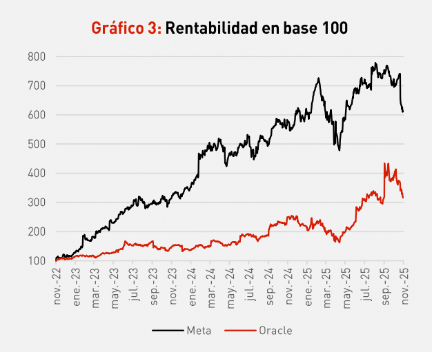 La pregunta que el mercado se plantea constantemente sobre la Inteligencia Artificial es si estamos ante una nueva burbuja. Las valoraciones de algunas compañías son exigentes y han subido con fuerza recientemente pero en la mayoría de los casos, estas alzas son respaldadas por una tendencia creciente en los beneficios empresariales así como en una demanda real por parte de las grandes compañías que al final son las que mejor conocen sus órdenes de pedidos y como evolucionan sus negocios. Además, la mayor parte de estas inversiones se financian con flujos de caja libres y cuando las empresas acuden a los mercados de deuda a encontrar financiación, sufren correcciones importantes en bolsa (véase el ejemplo de Meta, Oracle o Alphabet recientemente). Así pues, no podemos afirmar que estamos ante una burbuja por el mero hecho de que unas compañías hayan subido mucho.