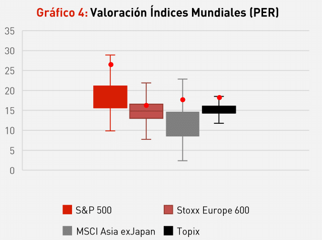 Durante el mes hemos mantenido el nivel de exposición a renta variable que habíamos alcanzado tras el reciente buen comportamiento de los principales índices bursátiles en lugar de realizar plusvalías. La decisión se fundamenta en una buena perspectiva a corto plazo para los mercados de equity pese a que los niveles son altos y los objetivos por parte de muchos analistas ya se han cumplido. Sin embargo, la euforia puede continuar y puede que en unos meses sea aún más difícil abrir nuevas posiciones con un mercado en máximos y unos tipos de interés más bajos. La preferencia sigue siendo por Estados Unidos Vs Europa y con exposiciones a medio y largo en bolsas asiáticas dado que tienen margen para seguir subiendo.