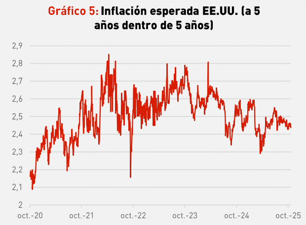 El mercado sigue descontando más de tres recortes por parte de la FED en 2026 algo que no casa con un escenario de crecimiento potencial cercano al 2% en términos nominales y una inflación que difícilmente veremos bajar del 2,5% el próximo año. Más aún si el crecimiento derivado de las inversiones en Inteligencia Artificial, los planes de desregulación y la rebaja de impuestos se llevan a cabo en los próximos meses. Por ello, consideramos que el principal riesgo está en un repunte de la inflación que dé al traste con los planes de la FED (y de D. Trump) de rebajar los tipos de interés para financiar más barato el gran déficit fiscal que acumula la primera economía del mundo. A este respecto, es posible que los aranceles aprobados sean revertidos en parte dada la inviabilidad legal que ha empezado a juzgar la Corte Suprema en la primera semana de Noviembre. De ser declarados ilegales, el Tesoro americano se quedaría sin una fuente de ingresos adicional perjudicando aún más la difícil situación de sus finanzas públicas.