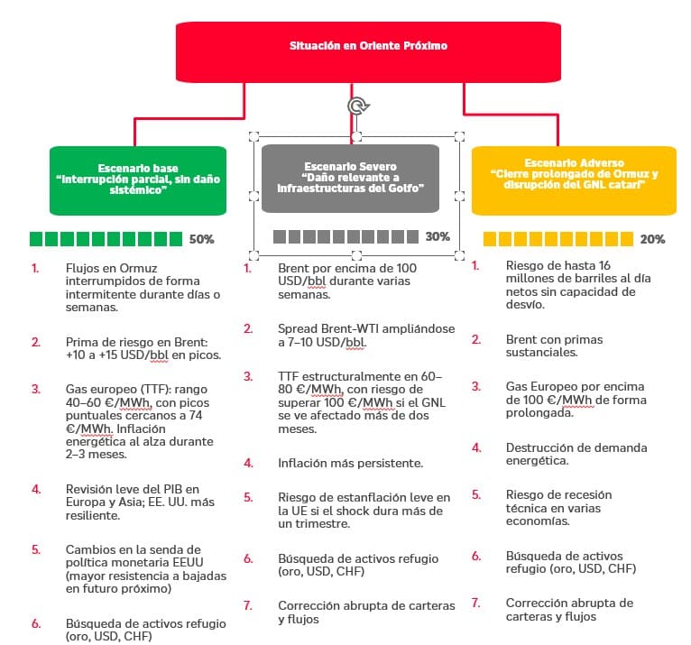 - Escenario severo (20%): Cierre prolongado del estrecho de Ormuz y/o daños a las instalaciones de Gas Natural Licuado en Qatar